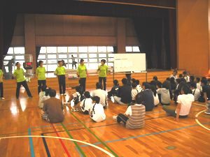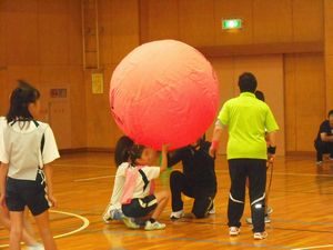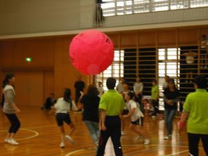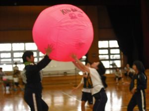 親子でキンボールをしました。準備運動として大きなボールを使った鬼ごっこを行い、その後、チーム毎に分かれてゲームを行いました。4人一組で3チームずつコートに入って7分間、ボールを飛ばしたり落とさないように支えたりしながら競い合いました。親子の息の合った動きが見せどころです。学級委員の皆さん、朝日町の体育指導員の皆さんのお陰で楽しい親子ふれあい活動になったことを感謝しています。