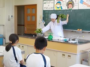 家庭科の時間に野菜の栄養やおいしい食べ方などについて、栄養教諭からお話を聞きました。インスタントな食事はどうしても炭水化物にかたよりがちです。食事における野菜の重要性を知り、バランスのとれた献立への関心が高まった様子でした。