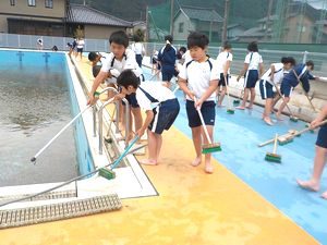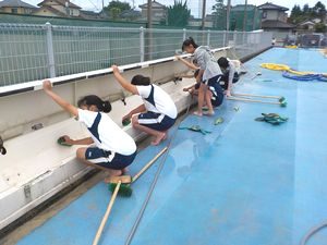 22日のプール開きに向けて、プール掃除を行いました。5年生はプールサイドや更衣室などの担当でした。少し肌寒く、あいにくの天候でしたが、みんな一生懸命磨いてずいぶんきれいになりました。23日には、毎年、ボランティアでプール清掃をしてくださっている石原孝之さん(元本校PTA会長)に細部にわたってプロフェッショナブルな仕上げ清掃をしていただきました。PTAの方のご厚意に支えられています。ありがとうございます。