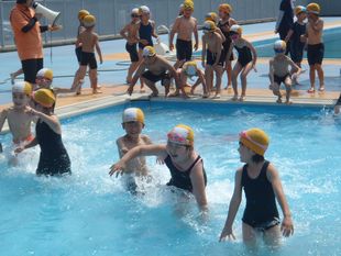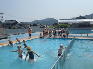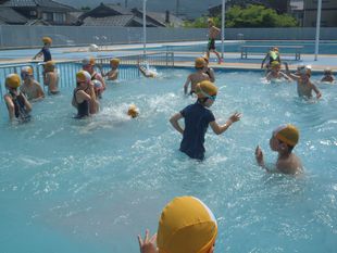 昨日はプール開きでした。さっそく1年生は、今日プールに入りました。朝から「プール入るんですか?」と。プールに入ることになり、ワクワクドキドキ。更衣室で着替え。準備体操をした後、シャワーを浴びて、プールに入り、水の中での活動を楽しみました。