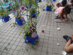 色とりどりの花をつかってみんな思い思いの色水をつくっていました。