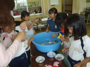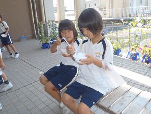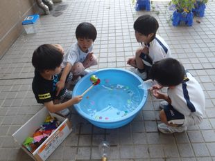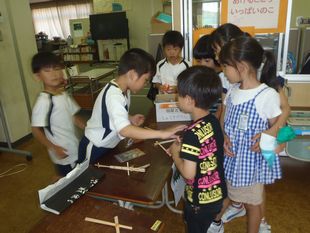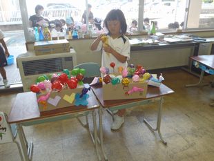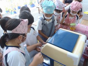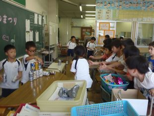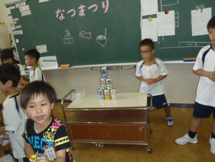 1年生で「夏祭り」をしました。みんなでどのお店をするか話し合って決め、夏祭りに向けて準備を進めてきました。前半と後半で、店番をする人と他のお店を回る人に分かれて活動しました。みんな協力をしてお店を開くことができ、お店番も上手でした。アサガオを見ながら、外で冷たいかき氷を食べ、暑い夏を楽しく過ごしていたようです。生き生きと活動していた子供たちはすてきでした。かき氷をつくるために氷をもたせていただき、ありがとうございました。
