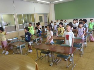 1学期も残すところ2日になりました。今日は、1学期のまとめの会を行いました。あわせて1学期末に転校していく友達のおわかれ会もしました。夏祭りのときにつくった折り紙で、みんなであっという間に黒板を飾りつけしたパワーにびっくり。その黒板を背景にみんなで記念写真も撮りました。始めに1年生が大好きな「WAになって踊ろう」を歌いました。そのあとにドッジボールやリレー、色おにをみんなで楽しみました。最後には、みんなでメッセージやプレゼントを渡しました。きっと心に残る思い出になったでしょう。まとめの会で、子供たちが協力して活動する姿に4月からの成長を感じました。
