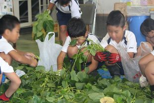 5月に植えた枝豆をつみ取りに行ってきました。子供たちは、大きく育った枝豆に驚いていました。雨だったため、職員の方に事前に切り取っておいてもらったものから収穫しました。子供たちは、我先にと競い合いながら枝豆を摘み取っていました。口々に、「夕ご飯にゆでてもらおう!」と言っていました。