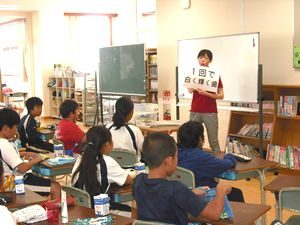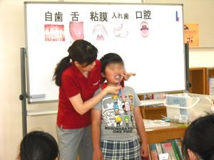 歯科衛生士の方よりお話をしていただき、教わったように歯磨きをしてみました。歯ぐきに沿って磨くことや舌を磨くことがむし歯や歯周病予防に効果的だということを聞き、実際にやり方を見せてもらった子供たちは、鏡をのぞき込みながら一生懸命歯磨きをしていました。