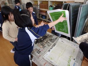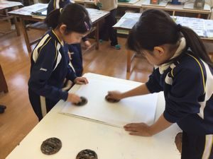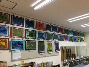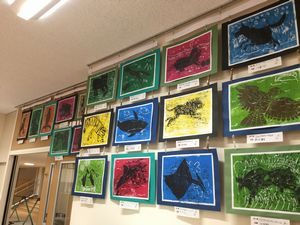 3年生は図画工作科の学習で、両面版画をしました。動物をテーマに、下絵を描き、彫刻刀でたくさん彫りました。今週は裏と表の2面を刷り、作品を完成させました。色の組み合わせを考えながら、友達と協力して活動することができました。作品は、ワークスペースに飾ってあります。