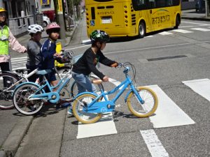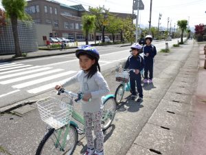 昨日は雨でしたので、警察の方から自転車の乗り方についてご指導いただきました。 翌日は晴れたので、大人の見守り人数が少ないので、ショートコースを設定して、公道で自転車に乗ってみました。 まだまだ危ないというのが正直な感想です。親御さんと一緒にしっかりと練習して、安全な自転車走行を身に付けましょう。