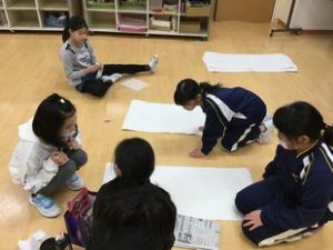 会場係の仕事について紹介します。会場係はめくり作りや会場の飾り付け案作成、体育館掲示用の大きなめあて看板を作成しています。大変な作業ですが役割を分担し、協力して作業を行ってきました。最近では各学年とのリハーサルなどでも活躍しました。明日の仕事ぶりに期待です。