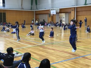 二学期から練習してきたなわとびを披露する日がやってきました。1年生は、「前跳び」「後ろ跳び」「あや跳び」「得意な技」を披露しました。あや跳びは特に1年生が力を入れて練習してきた技だったので、うまく披露することができてよかったです。