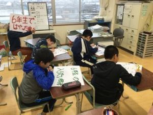 最後に演出係の仕事について紹介します。演出係は「発表」と「幕間」という2つの仕事があります。「発表」の子供たちは、5年生の発表の内容を考え、体育の時間などに中心となって練習を行いました。「幕間」の子供たちは、幕と幕の間のつなぎを考え、準備を進めてきました。明日の本番、5年生の出し物に注目してください。