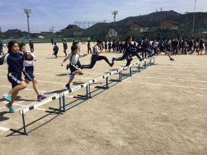 6年生は去年よりも高いハードルを5台跳びます。最初は高さに戸惑う子供もいましたが、すぐに慣れ、5年生をリードしていく姿にたくましさを感じました。放課後練習では、選手種目の練習が始まり、記録を伸ばそうと意欲をもって取り組む子供の姿も多く見られました。 忙しい毎日が続きますが、小学校生活最後の町体が悔いの残らないものになるよう、精一杯頑張ってほしいと思います。