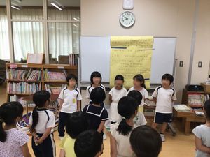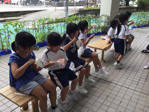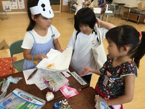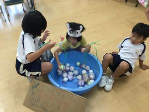 1年生でグループに分かれて、お店屋(めいろ、けんだまや、ほんや、おもちゃや、まといれや、さかなつりや、わなげや、きんぎょすくいや、かんたおしや、おめんや、よーよーつりや)をつくり、みんなで楽しみました。景品を袋いっぱいにもらって、子供たちは大喜びでした。特設のかき氷屋は、蒸し暑い日だったので、大盛況でした。