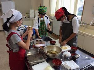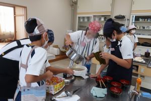 5年生は家庭科の学習で、みそしるを作りました。だしのとり方を学習し、「にぼしのだし」「こんぶだし」「こんぶとかつおぶしの合わせだし」の三種類を作り、飲み比べました。だしによってみそしるの味が変わることや、おいしくなることに気付くことができました。「にぼしのだし」のみそしるの人気が高かったです。また、じゃがいもと玉ねぎの切り方も学習し、来週の宿泊学習での野外炊飯もバッチリです!
