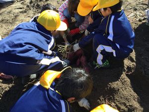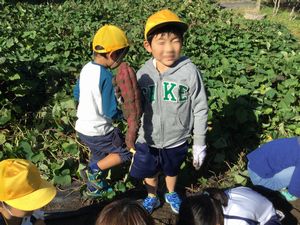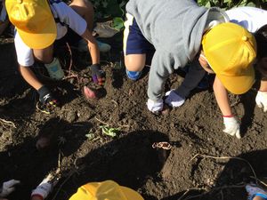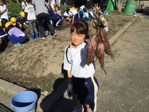 さつまいもを掘りました。さつまいもを見つけると友達と協力して、必死に掘っていました。巨大なさつまいもやいくつものさつまいもがつながっているものもあり、掘り出すのに大変苦労していました。「すごい、でかいのが掘れた。」と驚いていました。明日は、大学いもづくりです。秋の季節を十分味わうことができました。