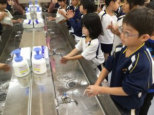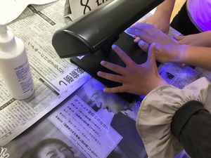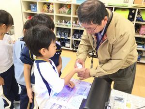 手洗いの大切さを聞いてから、手の洗い方を練習し、ジェルを塗った手をきれいに洗い流して、手洗いチェッカーできれいになっているか確認しました。1回ですぐきれいに洗えた子供もいれば、何度も洗い直していた子供もいました。指先がなかなかきれいに洗えないようでした。最後には、手洗い名人認定証をもらい、みんな大満足でした。これからのノロウイルス、インフルエンザ対策に、みんなでしっかり手洗いをしていきたいです。