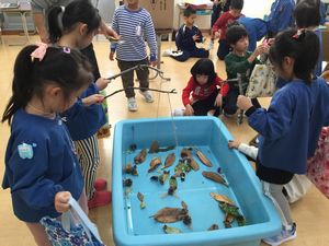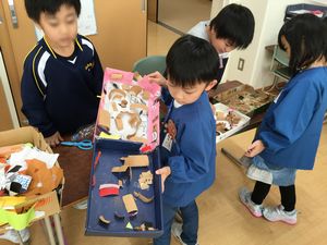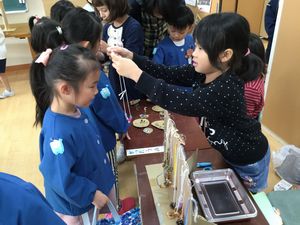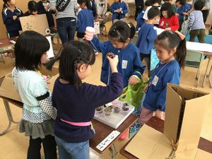15日〈金〉に1年生と保育園の年長さんとの交流会がありました。保育園の子供たちに喜んでもらおうと一生けんめい、秋のお店屋さんの準備をしてきた子供たちは、朝からワクワク、とても楽しみにしていました。たくさんのお客さんが来てくれて、張り切ってお店屋さんの仕事をしました。後半は、「猛獣狩りにいこうよ」「じゃんけんゲーム」を行い、1年生の子供たちも保育園の子供たちも笑顔いっぱいでした。