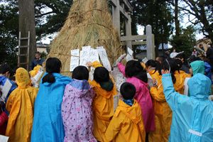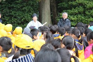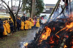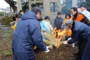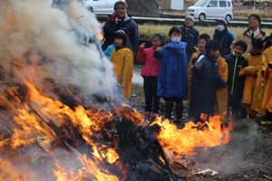 1・2年生で、佐味神社の左義長を見に行ってきました。今まで書き初め練習した作品も持って行って燃やしました。「高く上がると、字が上手になるよ。」と地区の方から教えていただき、燃えさかる火を子供たちは、歓声をあげて見ていました。昔から伝わる伝統行事について、神主さんから説明してもらいました。